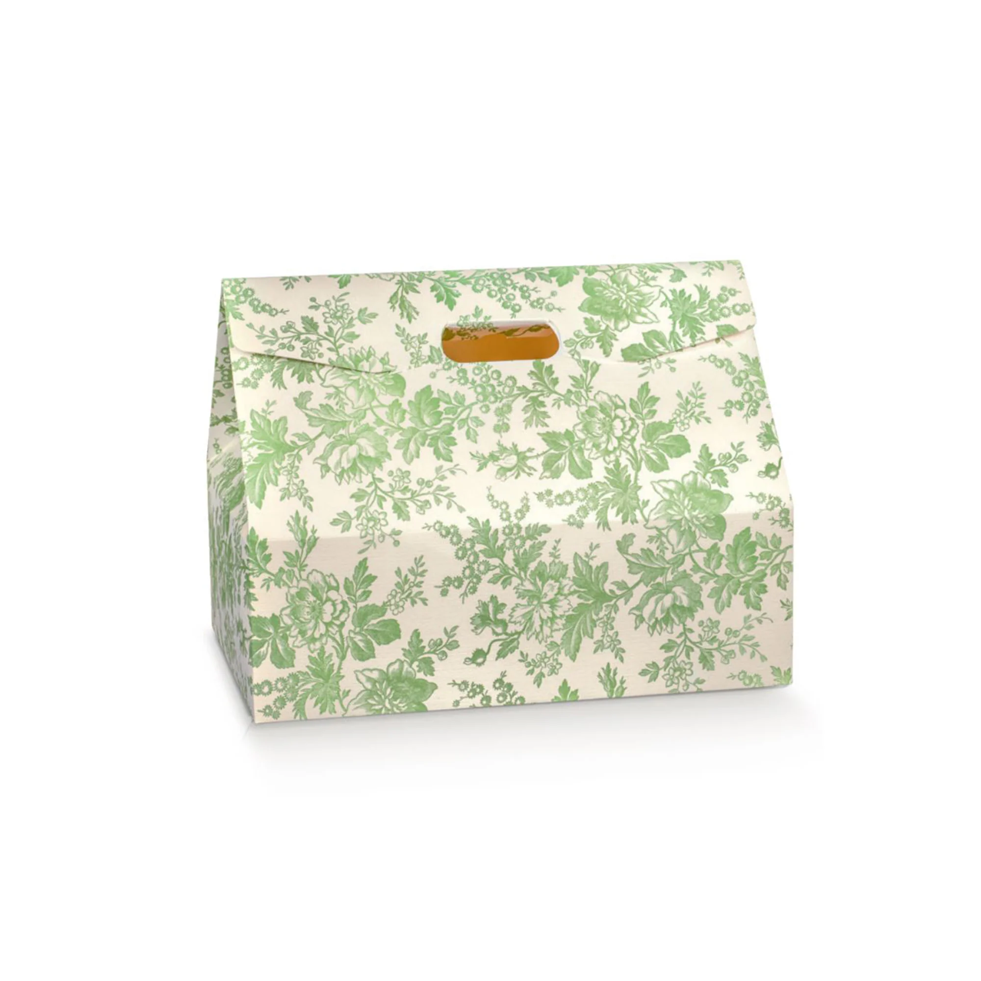 Bauletto Pasquale Porta Colomba fiori verdi. Confezione da 30 scatole porta Colomba Pasquale modello Bauletto, realizzate cartoncino ecologico accoppiato con politenato in PE, idoneo al contatto alimentare. Sono perfette per il confezionamento veloce di Colombe di Pasqua. Dotate di manico fustellato e fantasia floreale stampata, sono perfette per contenere colombe di pasticceria.