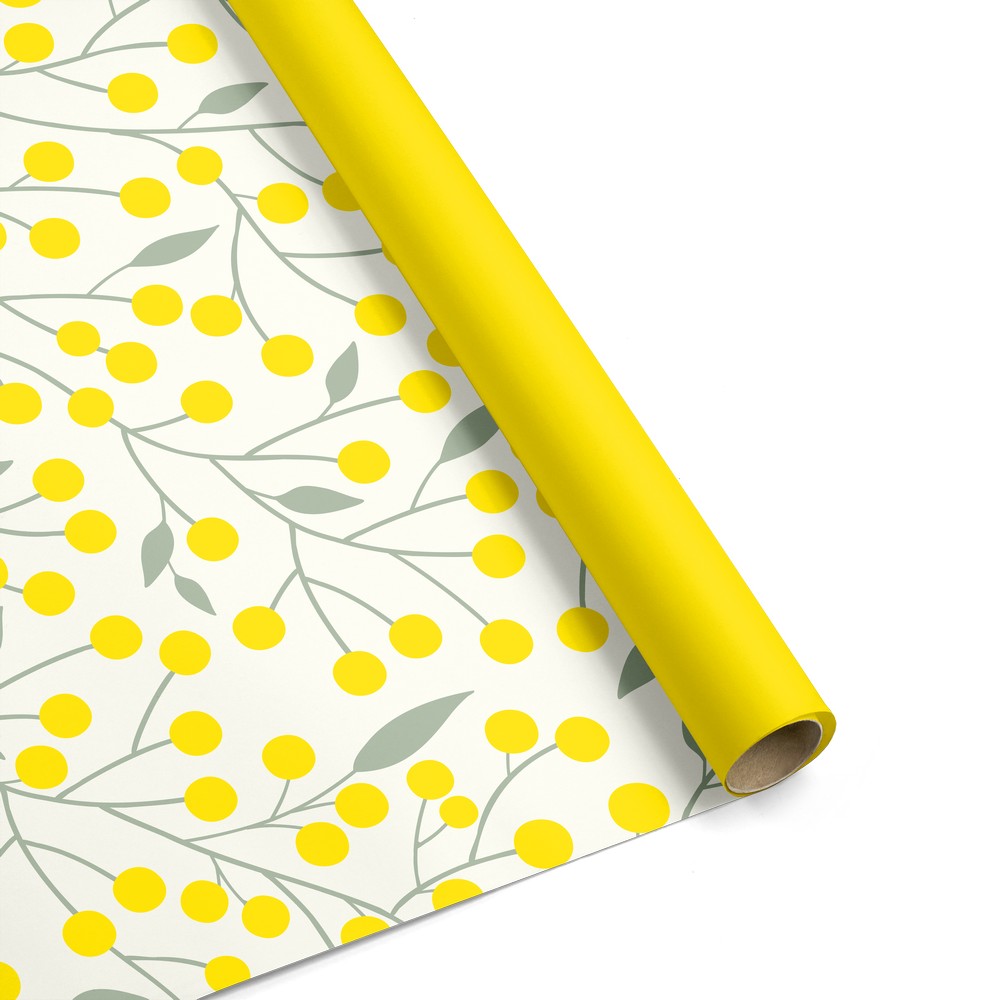 Bobina PPL fantasia Mimosa. Rotolino carta regalo in polipropilene con fantasia Mimosa stampata da un lato, e l’altro lato tinta unita gialla. Perfetta per cesti regalo, bouquet di fiori, cestini e confezioni, ma anche confezioni di Pasticceria.