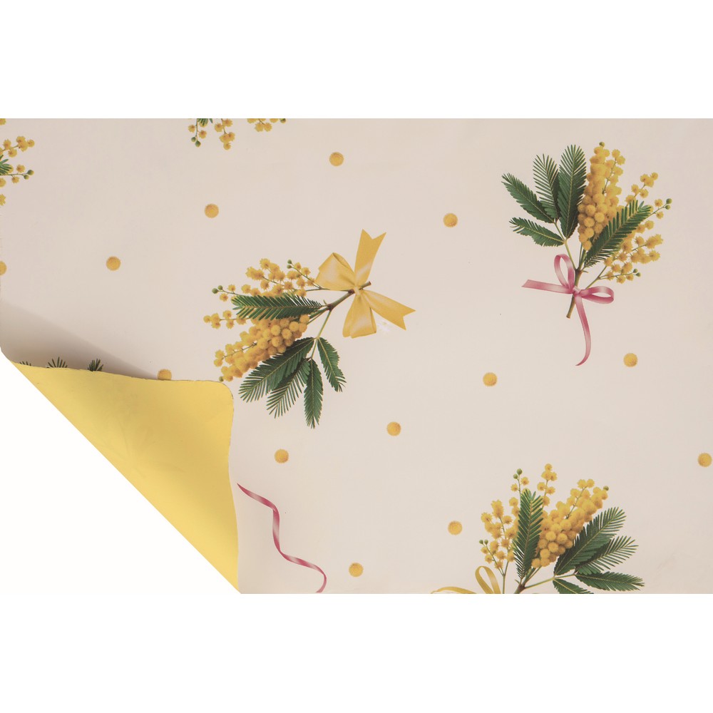 Bobina PPL fantasia Mimosa Chanelle. Rotolino carta regalo in polipropilene con fantasia Mimosa stampata da un lato, e l’altro lato tinta unita gialla. Perfetta per cesti regalo, bouquet di fiori, cestini e confezioni, ma anche confezioni di Pasticceria.