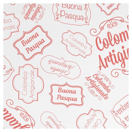 Carta pelleaglio per incarto Colombe Artigianali. Carta per pasticceria da 50 gr perfetta per incarto di Colombe Artigianali. Idonea al contatto diretto con gli alimenti e con stampa generica Pasquale in color rosso/corallo.