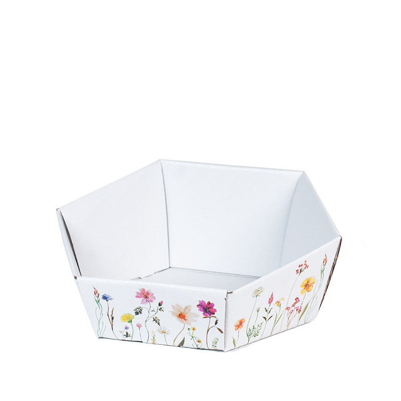 Cesto per confezioni in cartone fantasia pasquale. Cesto in cartone bianco a forma esagonale con fantasia Pasquale stampata. Perfetto per confezioni di prodotti enogastronomici vari o da oggettistica da esposizione. Facilissimo da montare.