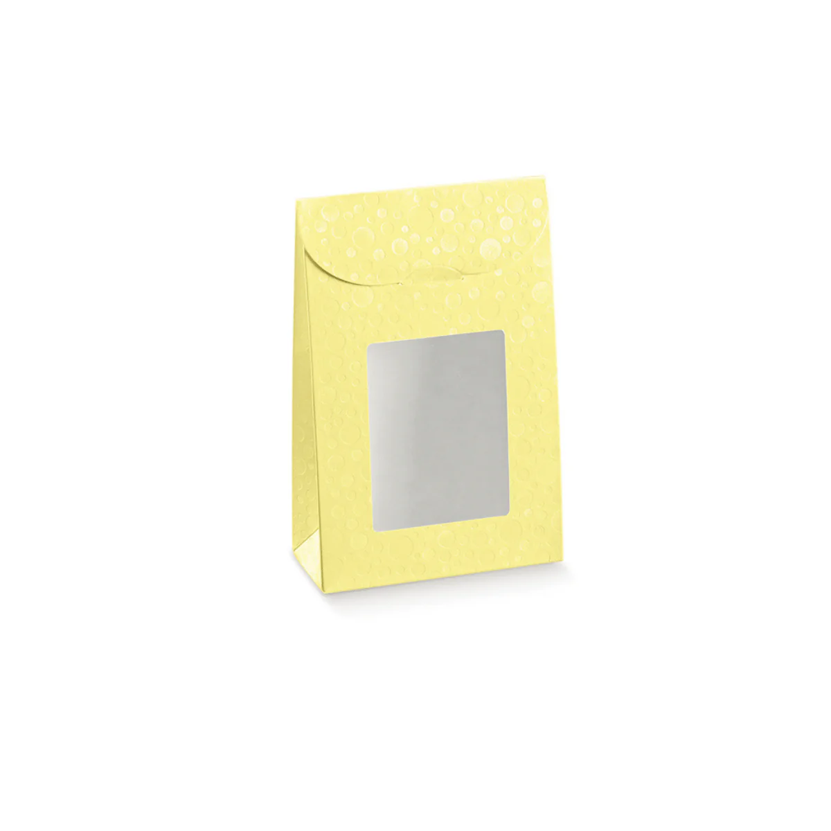 Sacchetti gialli per alimenti richiudibili con finestra. Sacchetti in cartoncino con finestra in PVC, soffietto laterale e chiusura frontale a incastro. Idonei al contatto diretto alimentare.