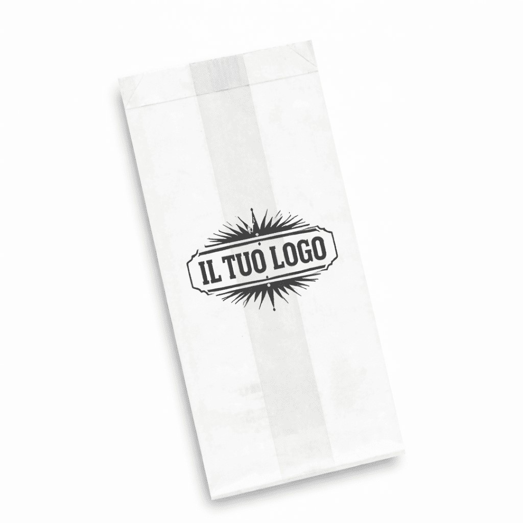 Sacchetti in carta per alimenti bianchi personalizzati. Un classico per il mondo dei panifici, pasticcerie, fornerie e del settore food in generale, i Sacchetti carta per alimenti personalizzati sono realizzati in carta kraft bianca da 43gr.