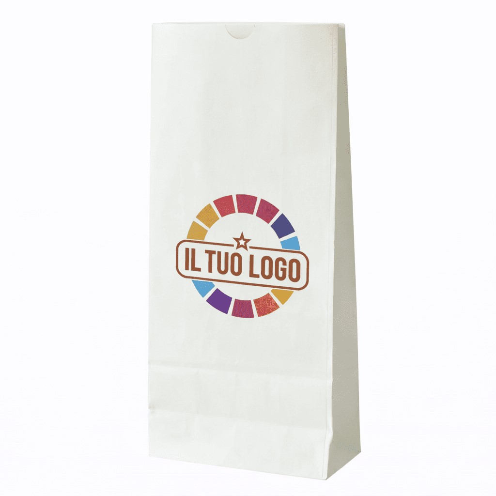 Sacchetti in carta rinforzata per farina e legumi PERSONALIZZATI, con stampa a colori. Sacchetto in carta rinforzata con fondo quadro, ideale imballaggio alimentare per confezionare la farina, cereali e legumi. Idonei al contatto diretto con alimenti. Realizzati in carta doppia con carta esterna bianca e interna avana per garantire una maggiore resistenza.