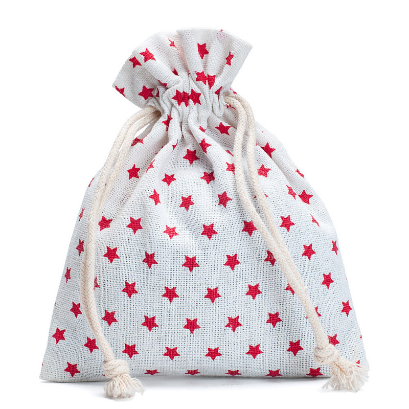 Sacchetti in cotone bianco fantasia Stelline. Sacchettini realizzati in cotone con pratico laccetto e fantasia stelline. Perfetti come bomboniere o per confezioni regalo.
