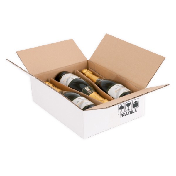 Scatola per bottiglie con alveare orizzontale. Scatole in cartone due onde microtriplo con alveare orizzontale ideali per trasporto bottiglie da 75 cl. Scatole realizzate in cartone bianco resistente, con alveare orizzontale per mantenerle ferme. Garantiscono la massima sicurezza durante il trasporto
