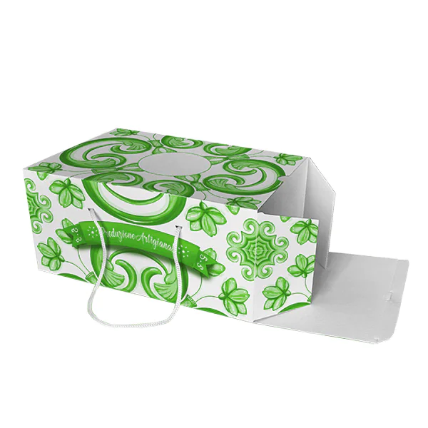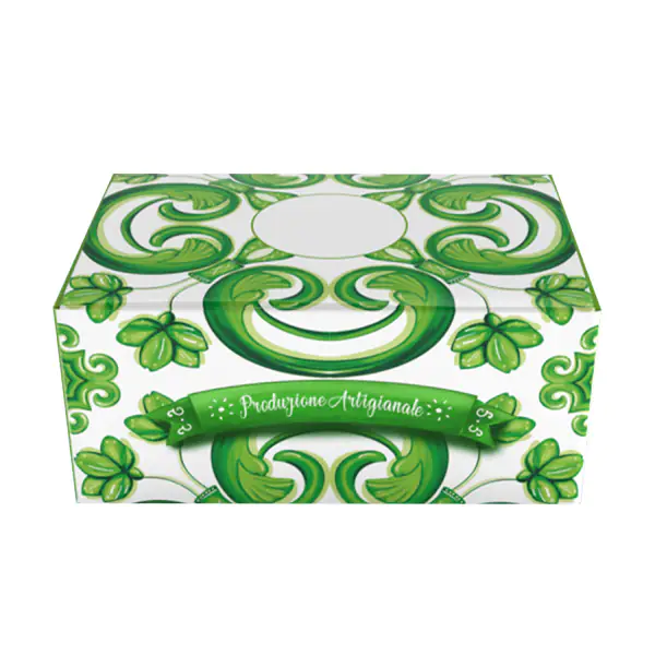 Scatola porta Colomba Maiolica Verde. Confezione da 25 scatole astuccio porta Colomba Pasquale in cartone accoppiato di alta qualità stampato con fantasia maiolica in verde. Idonee al contatto alimentare. Sono perfette per il confezionamento veloce di Colombe di Pasqua da 750 gr / 1 Kg. Dotate di manici laterali in cordino di cotone sono perfette per contenere colombe di pasticceria.