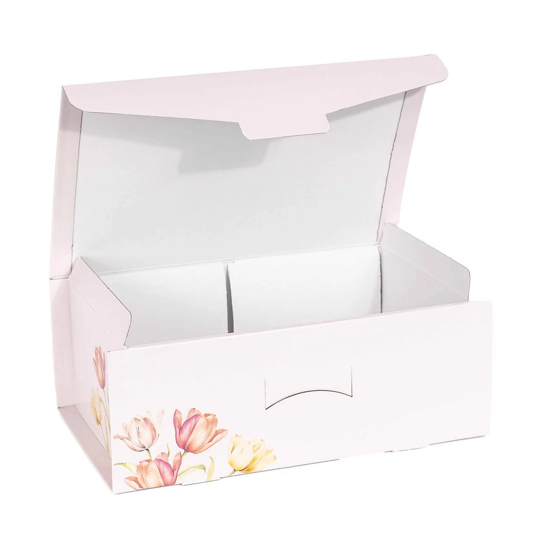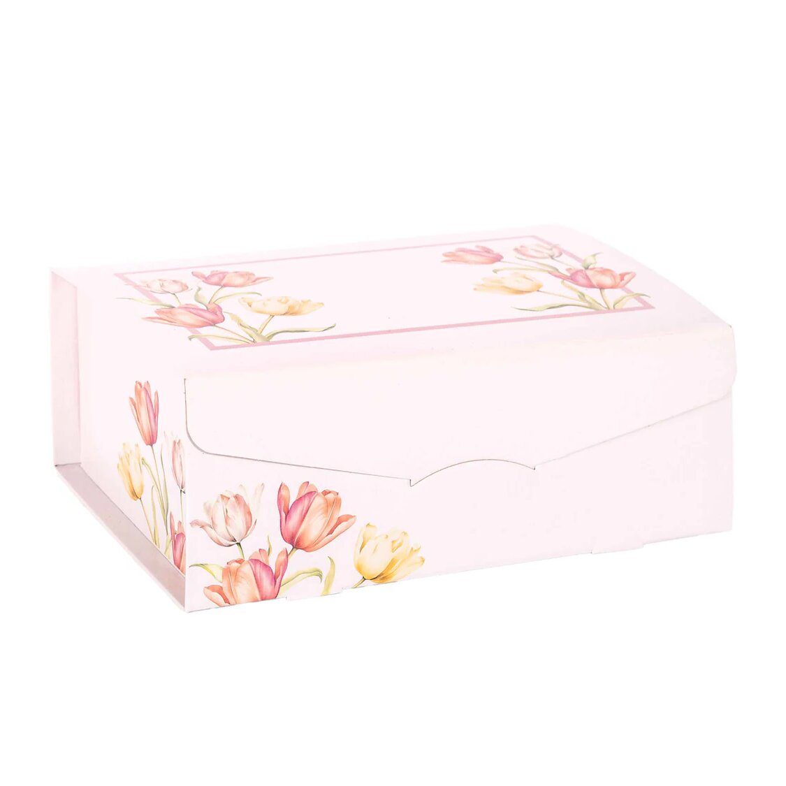 Scatola regalo in cartone senza manici Tulips. Scatola per confezioni in cartone accoppiato stampato con fantasia floreale primaverile, modello senza manici con chiusura frontale. Perfette per contenere prodotti di ogni tipo, dagli articoli regalo a prodotti di gastronomia o enoteca. Possono contenere anche una colomba da 1 Kg