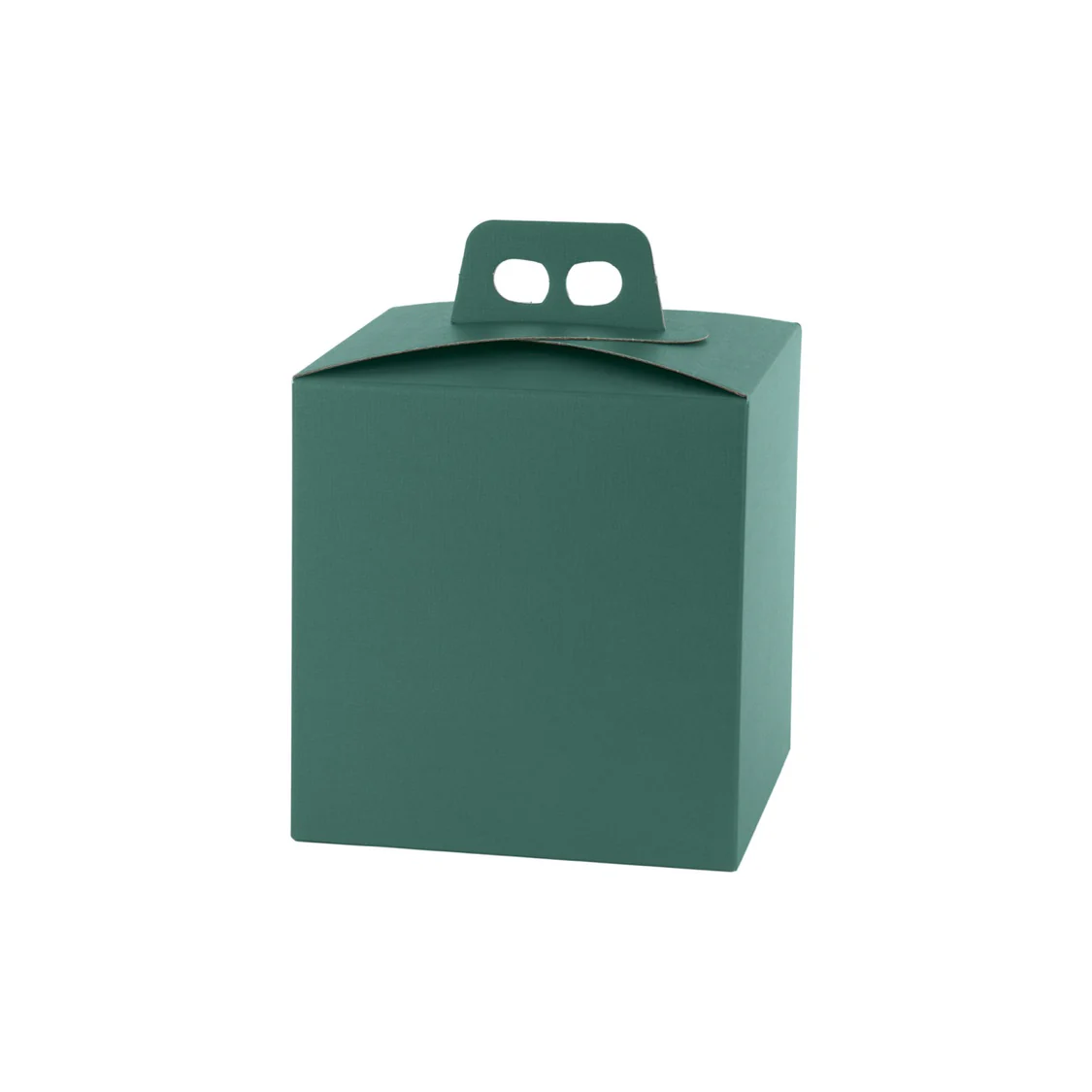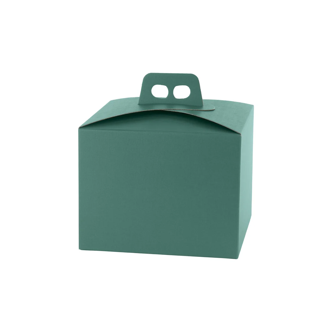 Scatole porta panettone quadrella verde. Scatole per panettone realizzate in cartoncino teso di colore fibra verde con pratica maniglia per chiusura ad incastro. Perfette per contenere panettoni di pasticceria artigianale.