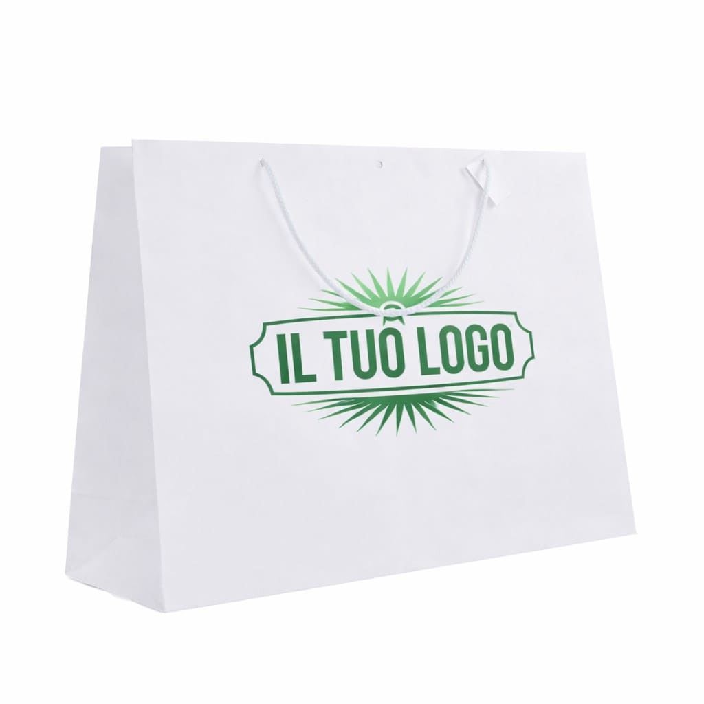 Shopper Carta Lusso bianca con Tag & Foro PERSONALIZZATE con stampa a Colori. Shopper in carta pregiata Kraft bianca resistente da 210 gr. Manico in cotone con cartoncino tag incluso. Foro per chiusura con nastro e soffietto laterale e sul fondo. Con Cartoncino di rinforzo sul fondo.