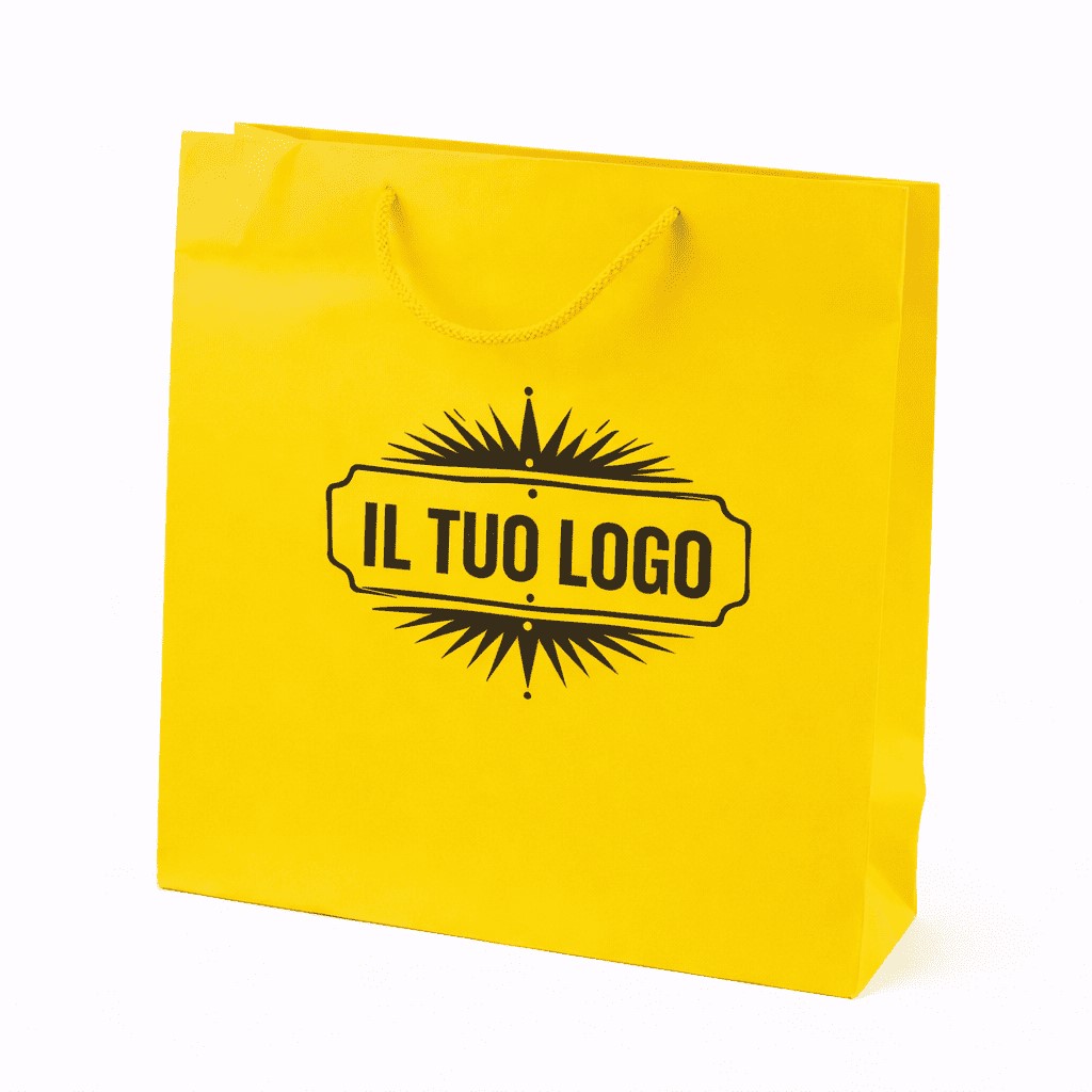 Shopper Gialla Lusso PERSONALIZZATA con stampa Logo a 1 colore. Shoppers in carta kraft colorata personalizzate con manici in cotone, listelli di rinforzo laterali e sul fondo.