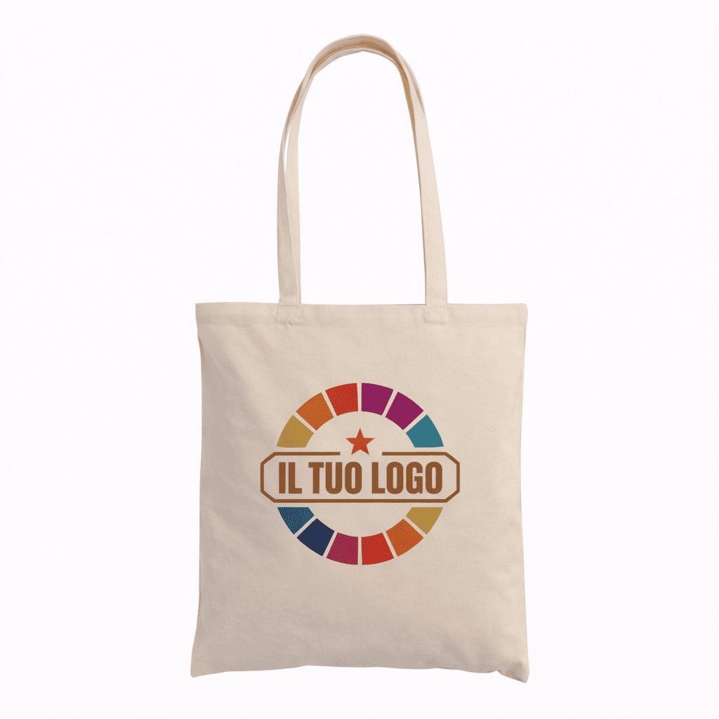 Shopper in cotone naturale PERSONALIZZATE con stampa a Colori. Shopper regalo in tessuto 100% naturale resistente da 140 g/m² personalizzate con stampa a Colori su 1 o 2 Lati. Sono lavabili e riutilizzabili. Con manico lungo da 67 cm.