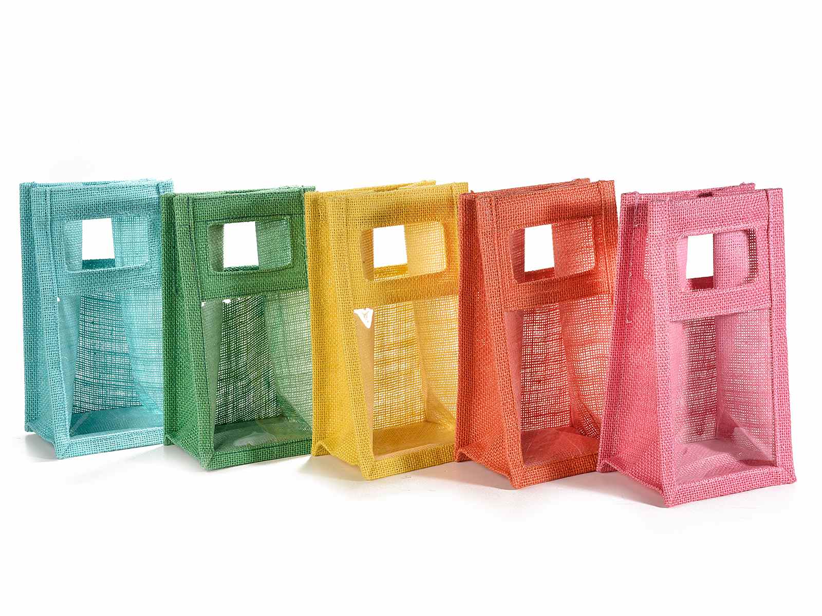 Shopper in juta colorata con manici e finestra. Shopper in juta colorata con manici a fagiolo e finestra trasparente. 5 Colori primaverili assortiti.