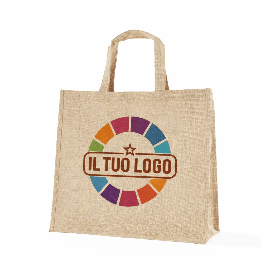 Shopper in juta PERSONALIZZATE con stampa a Colori. Buste regalo in juta naturale resistente personalizzate con stampa a Colori su 1 Lato. Sono lavabili e riutilizzabili grazie al rivestimento interno plastificato. Con manici piatti e soffietti laterali.