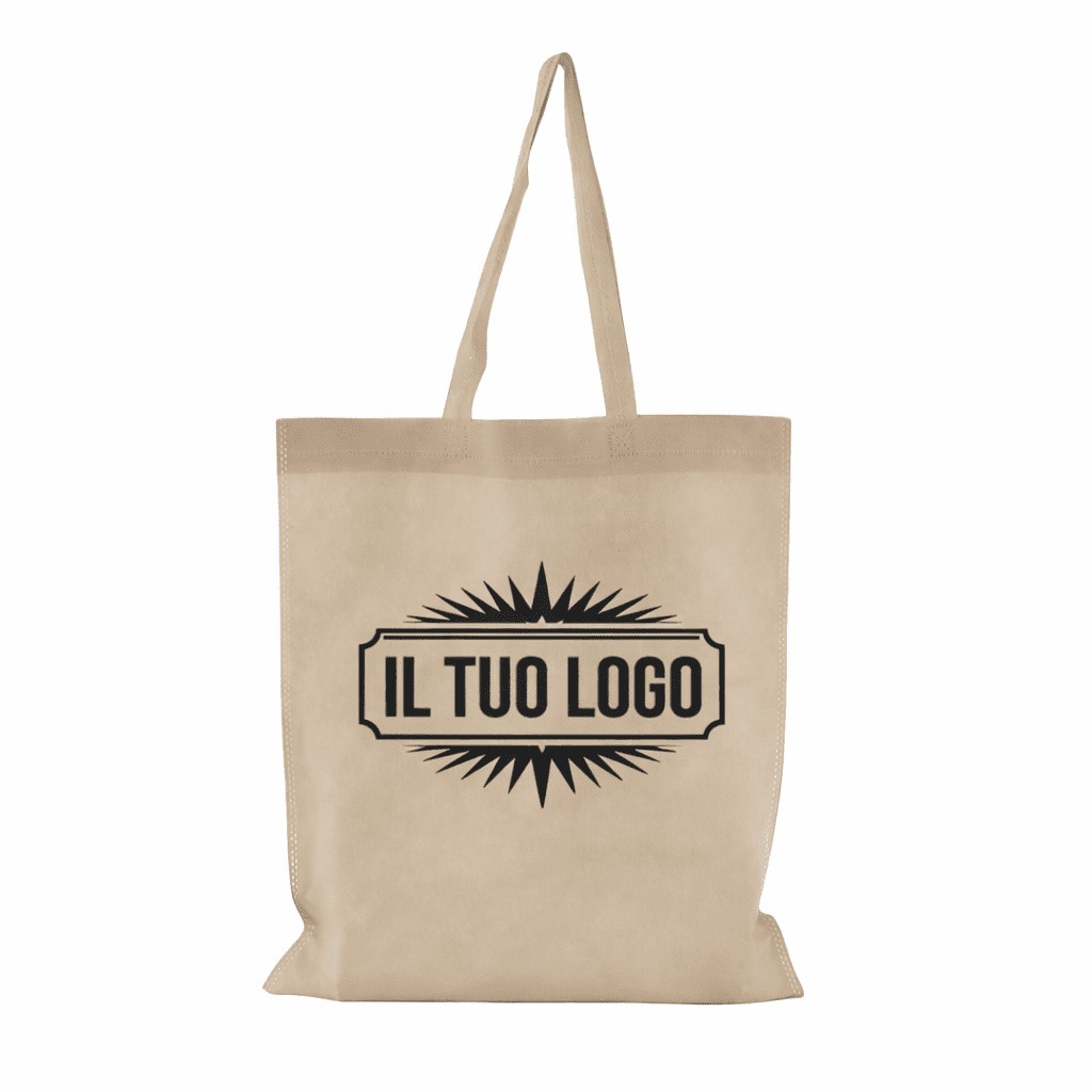 Shopper in TNT naturale PERSONALIZZATE con stampa a 1 Colore. Buste regalo in TNT naturale resistente personalizzate con stampa a 1 Colore su 2 Lati. Sono lavabili e riutilizzabili. Con manico lungo