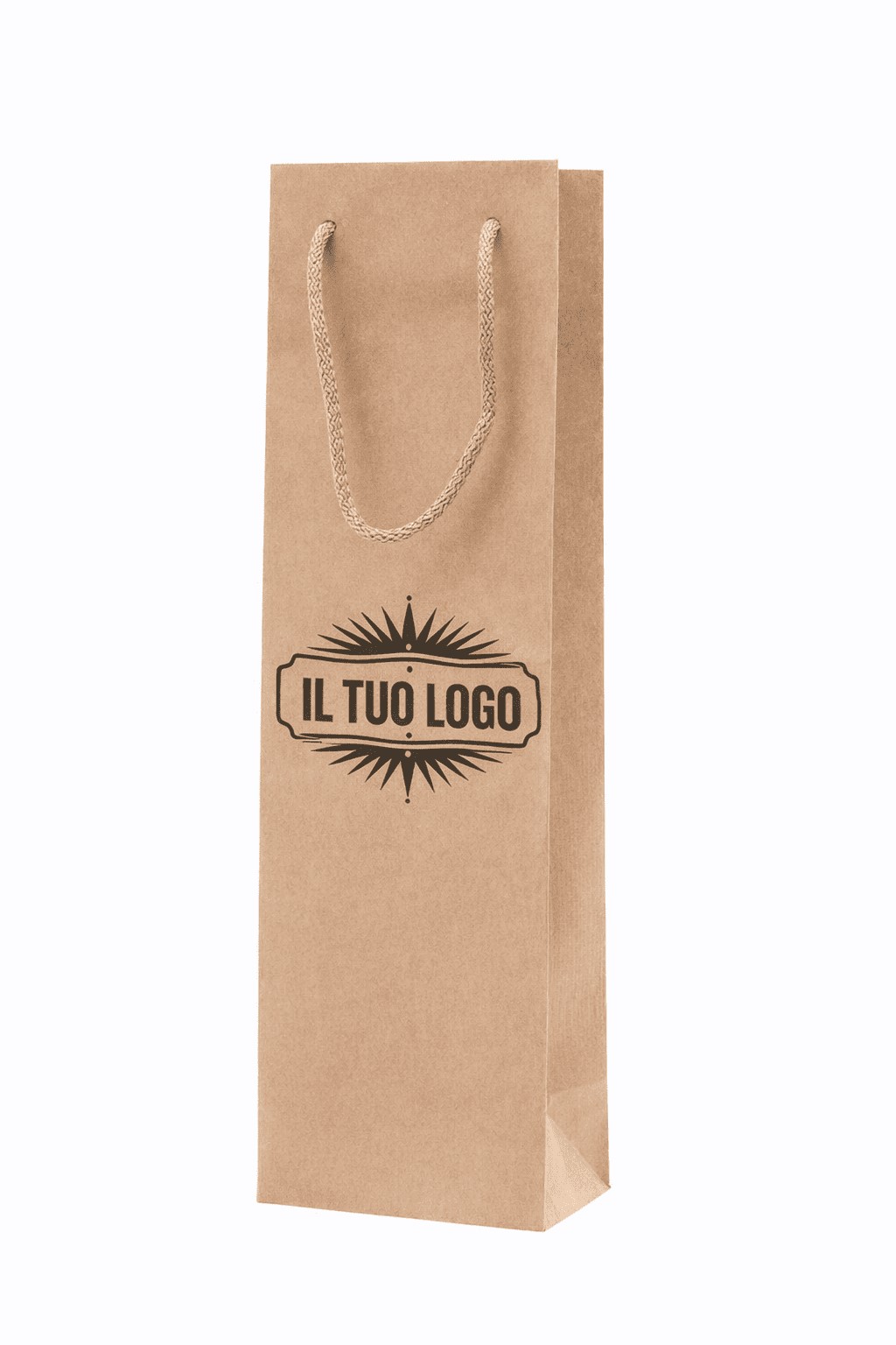 Shopper per bottiglie avana personalizzate con stampa del Logo a 1 colore. Shopper economiche per bottiglie di vino in carta kraft avana rigata. Stampa del Logo in serigrafia su ambo i lati.